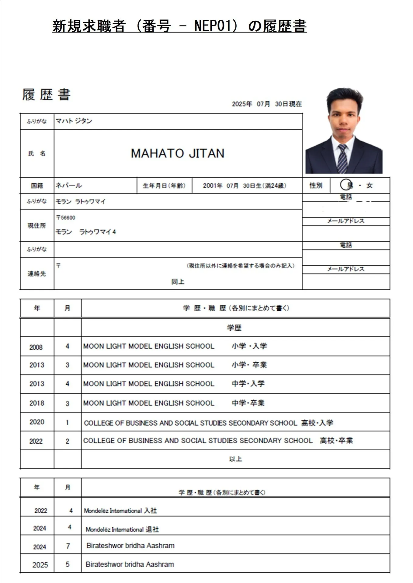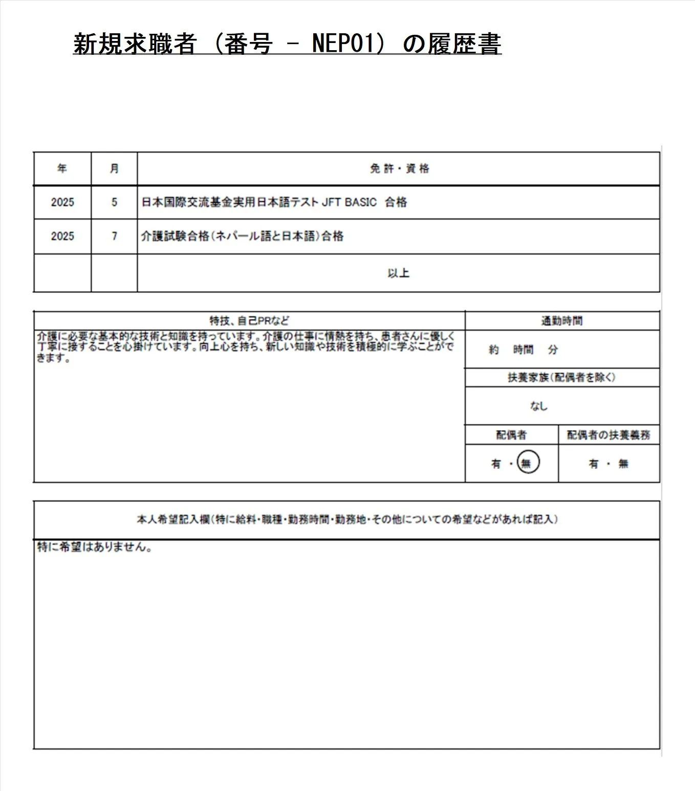 介護希望・求職者(番号-NEP01)プロフィール・履歴書(ネパール人・男性) 25.9.30時点