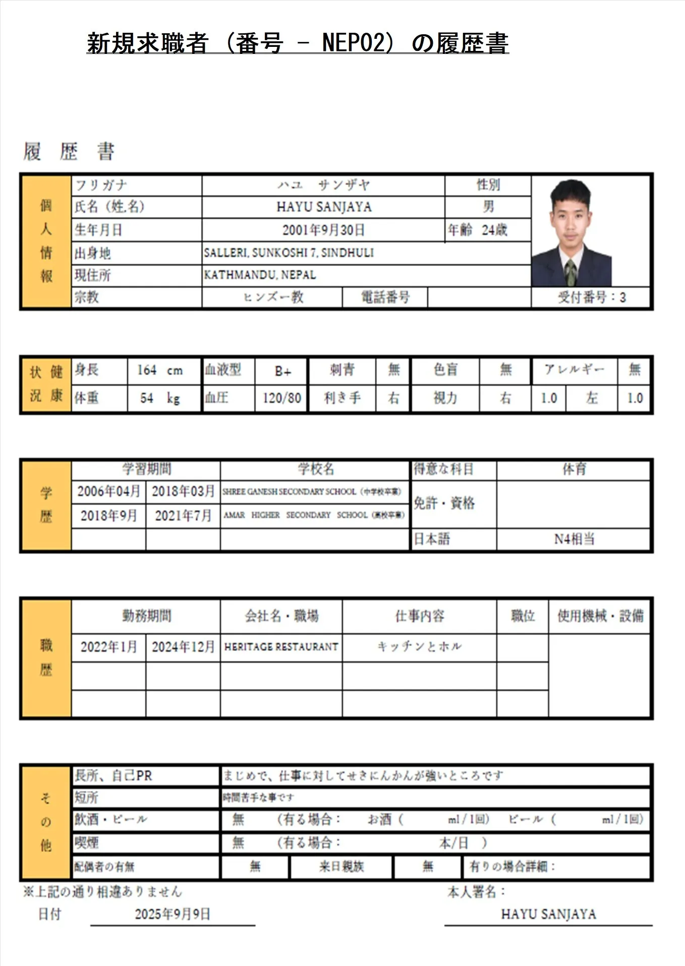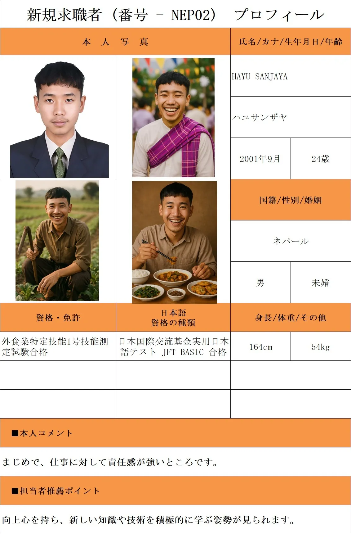 外食希望・求職者(番号-NEP02)プロフィール・履歴書(ネパール人・男性) 25.9.30時点