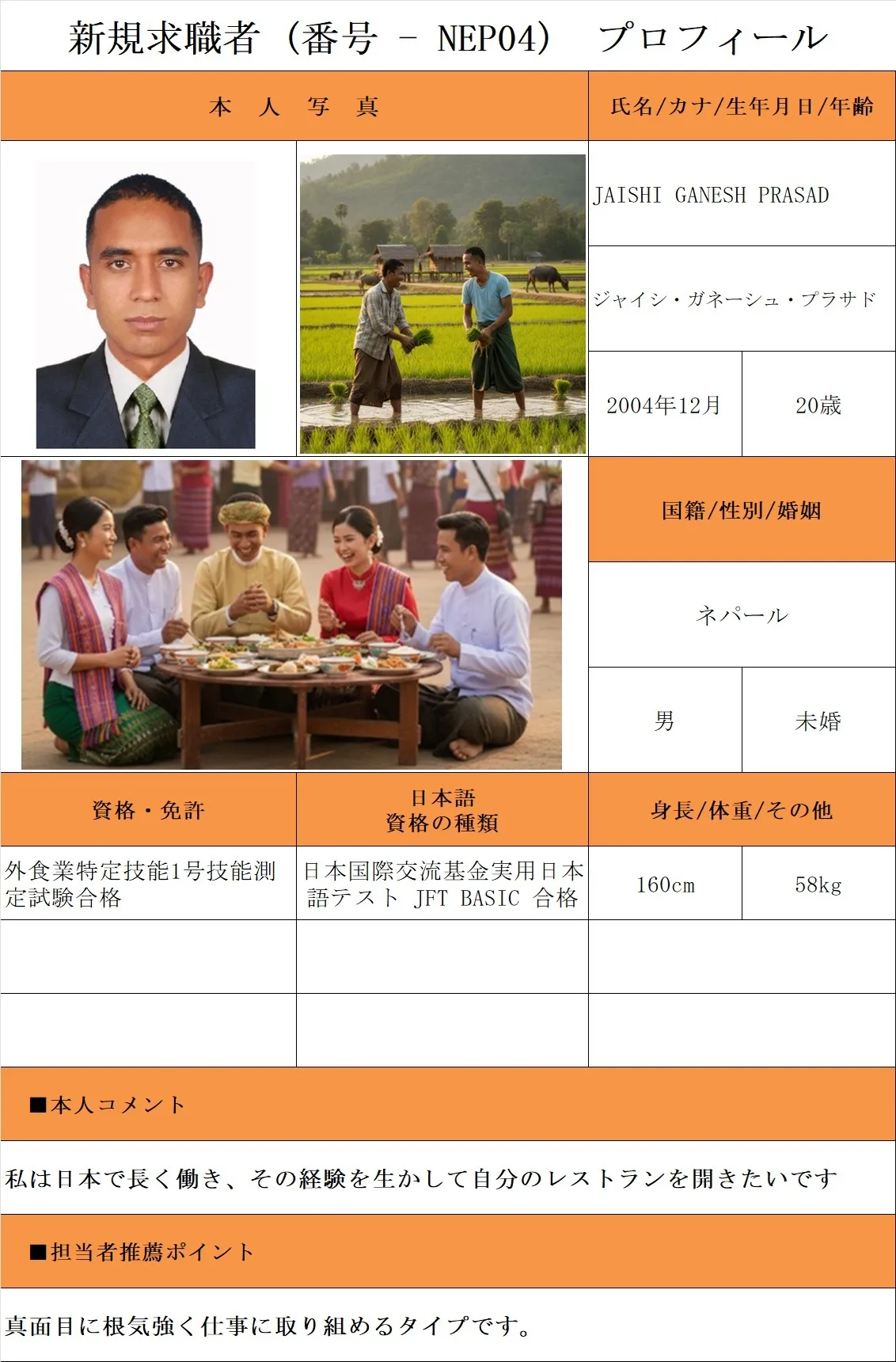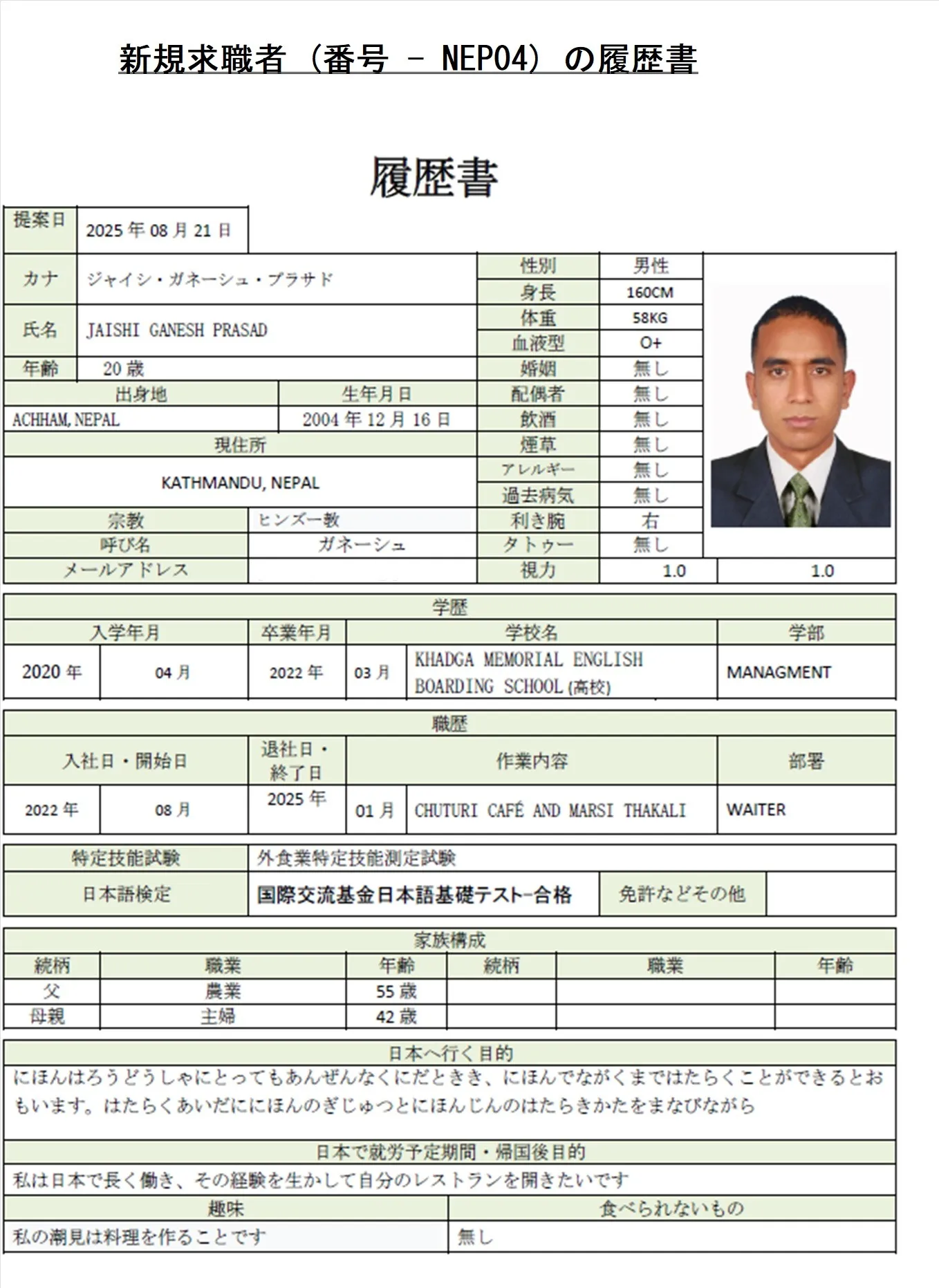 外食希望・求職者(番号-NEP04)プロフィール・履歴書(ネパール人・男性) 25.9.30時点