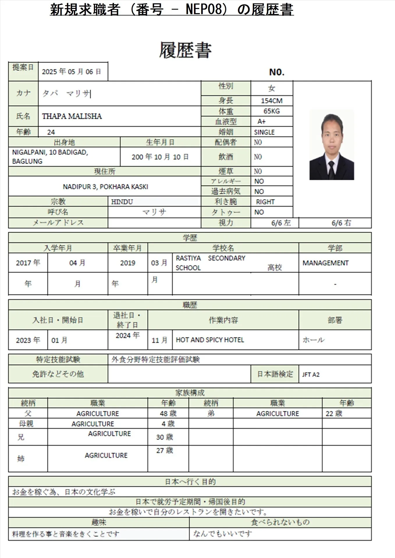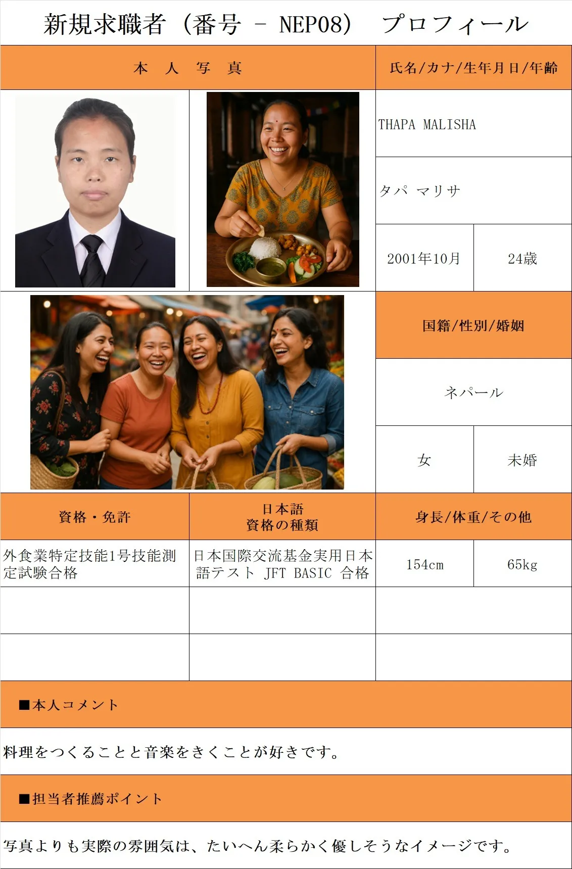 外食希望・求職者(番号-NEP08)プロフィール・履歴書(ネパール人・女性) 25.10.1時点