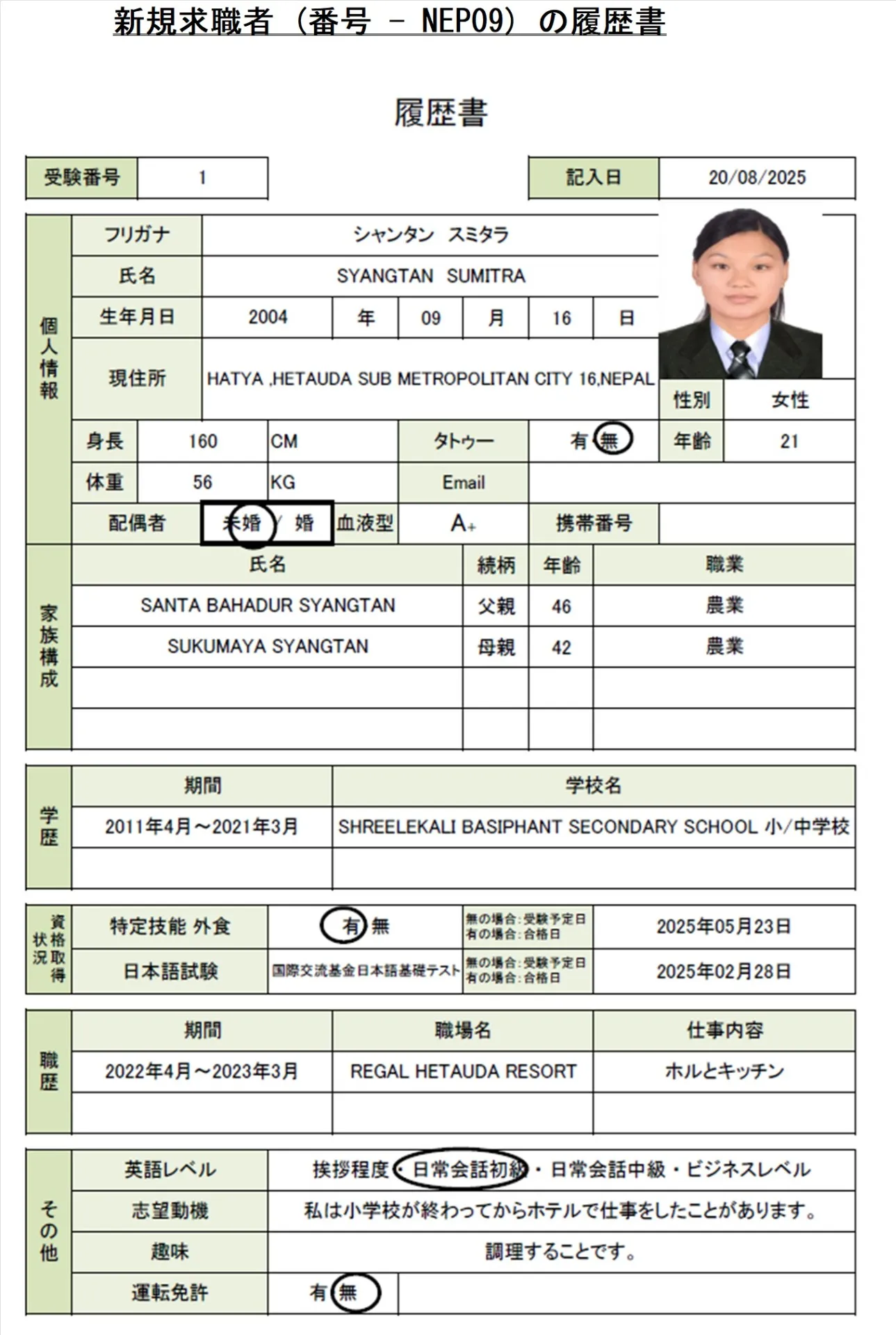 外食希望・求職者(番号-NEP09)プロフィール・履歴書(ネパール人・女性) 25.10.1時点