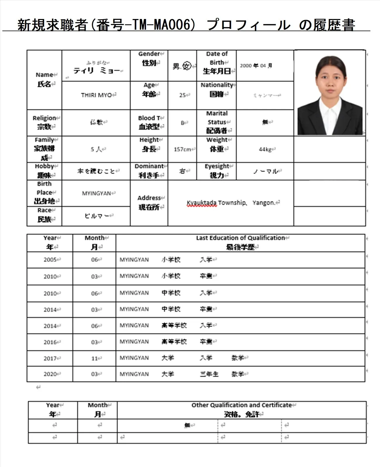 外食希望・求職者(番号-TM-MA006)プロフィール・履歴書(ミャンマー人・女性) 26.1.8時点