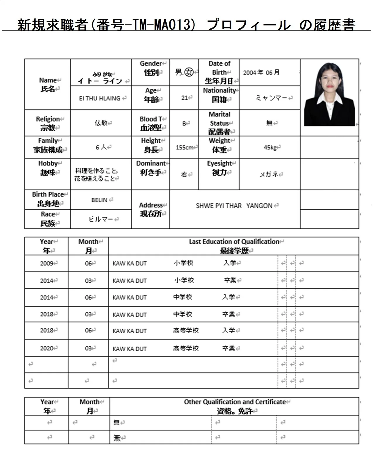 外食希望・求職者(番号-TM-MA013)プロフィール・履歴書(ミャンマー人・女性) 26.1.8時点