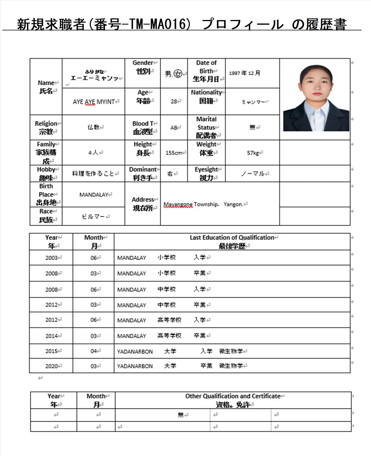 外食希望・求職者(番号-TM-MA016)プロフィール・履歴書(ミャンマー人・女性) 26.1.8時点