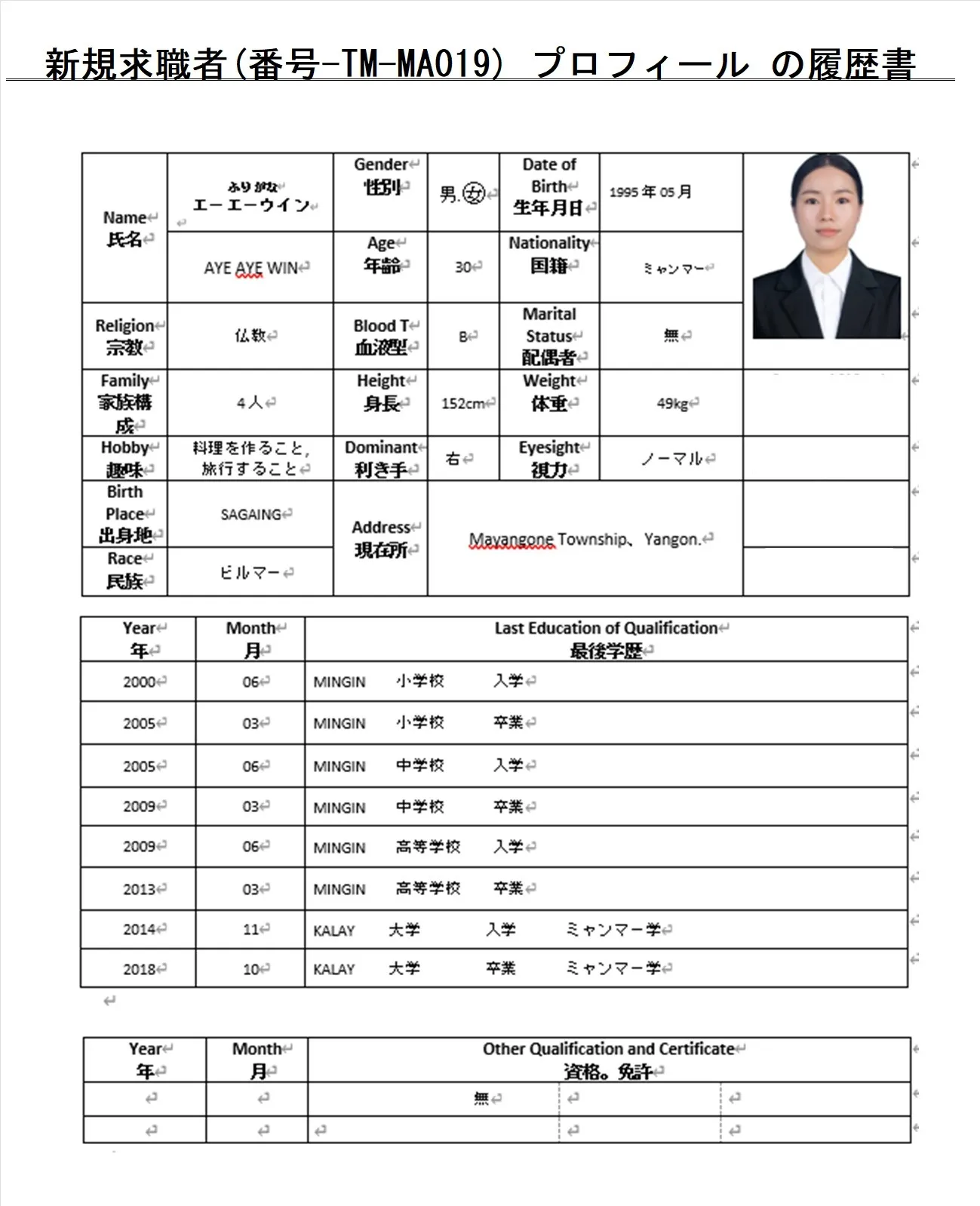 外食希望・求職者(番号-TM-MA019)プロフィール・履歴書(ミャンマー人・女性) 26.1.8時点